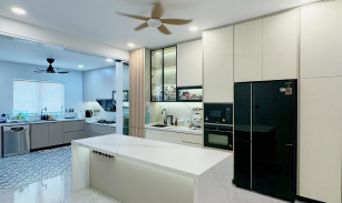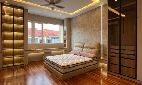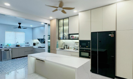 A minimalist, sophisticated, and warm ambiance design. Grey serves as the main colour, creating a calm and modern feel. It is complemented by deep wood tones, adding warmth and balancing the coolness of grey. Gold handles further enhance the space with refined details and a touch of elegance.